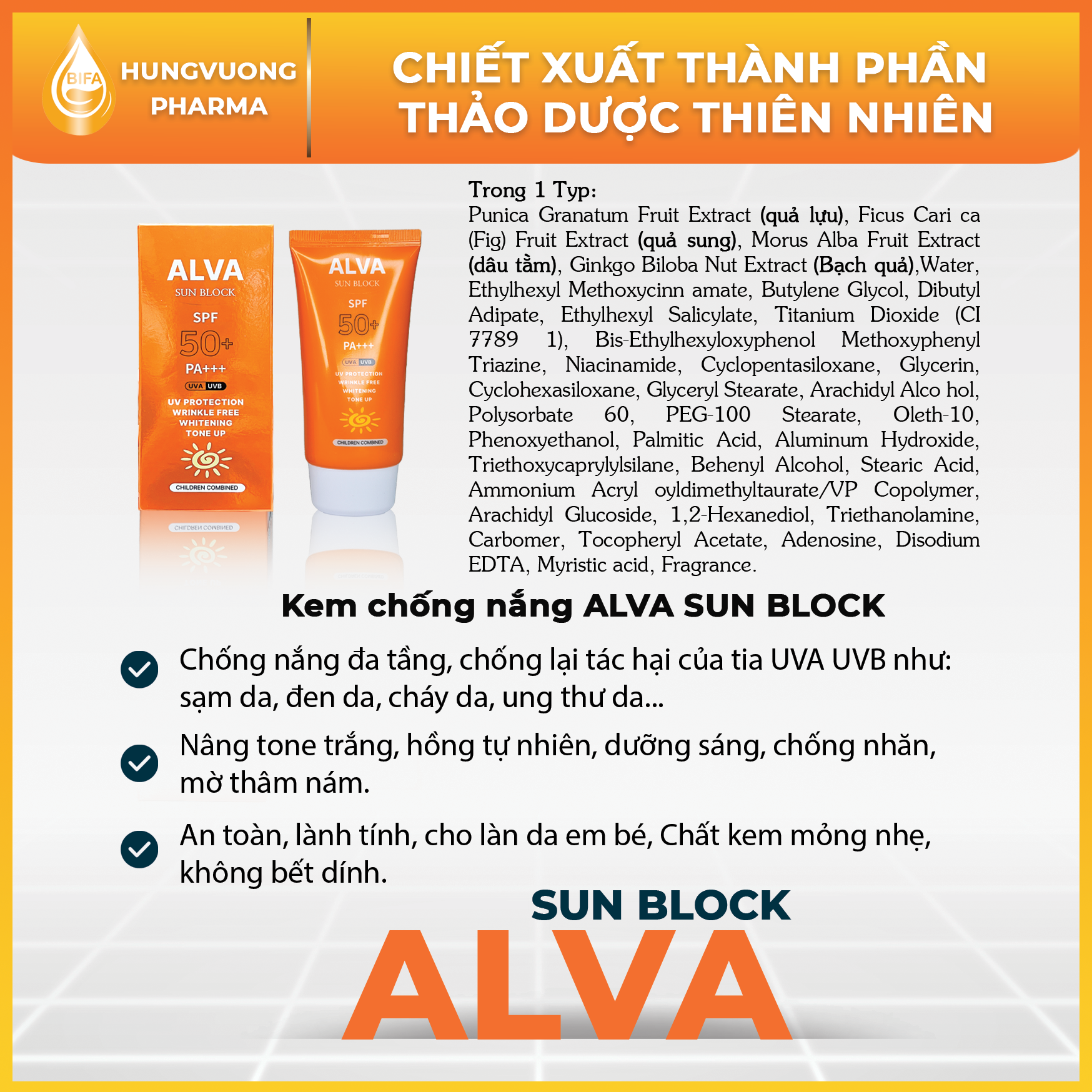 Với chỉ số SPF50+/PA+++ kem chống nắng Alva Sun Block vừa có tác dụng chống lại cả tia UVB (gây bỏng rát da) lẫn UVA (gây kích ứng da) giúp ngăn chặn những tác hại từ hai tia này và làm giảm huyết sắc tố Melanin biểu hiện qua da và ngăn chặn lão hóa da sớm dẫn đến ung thư da