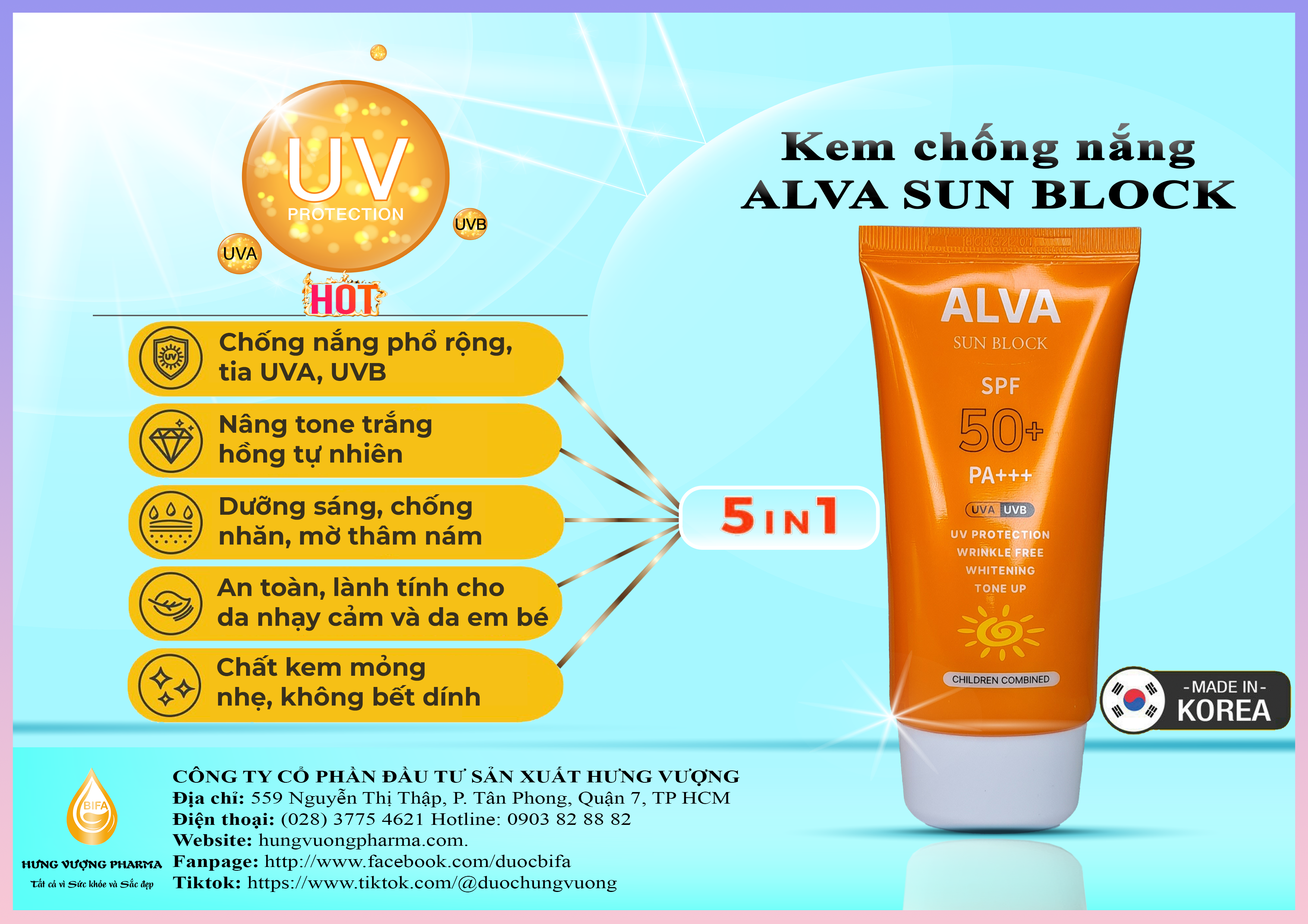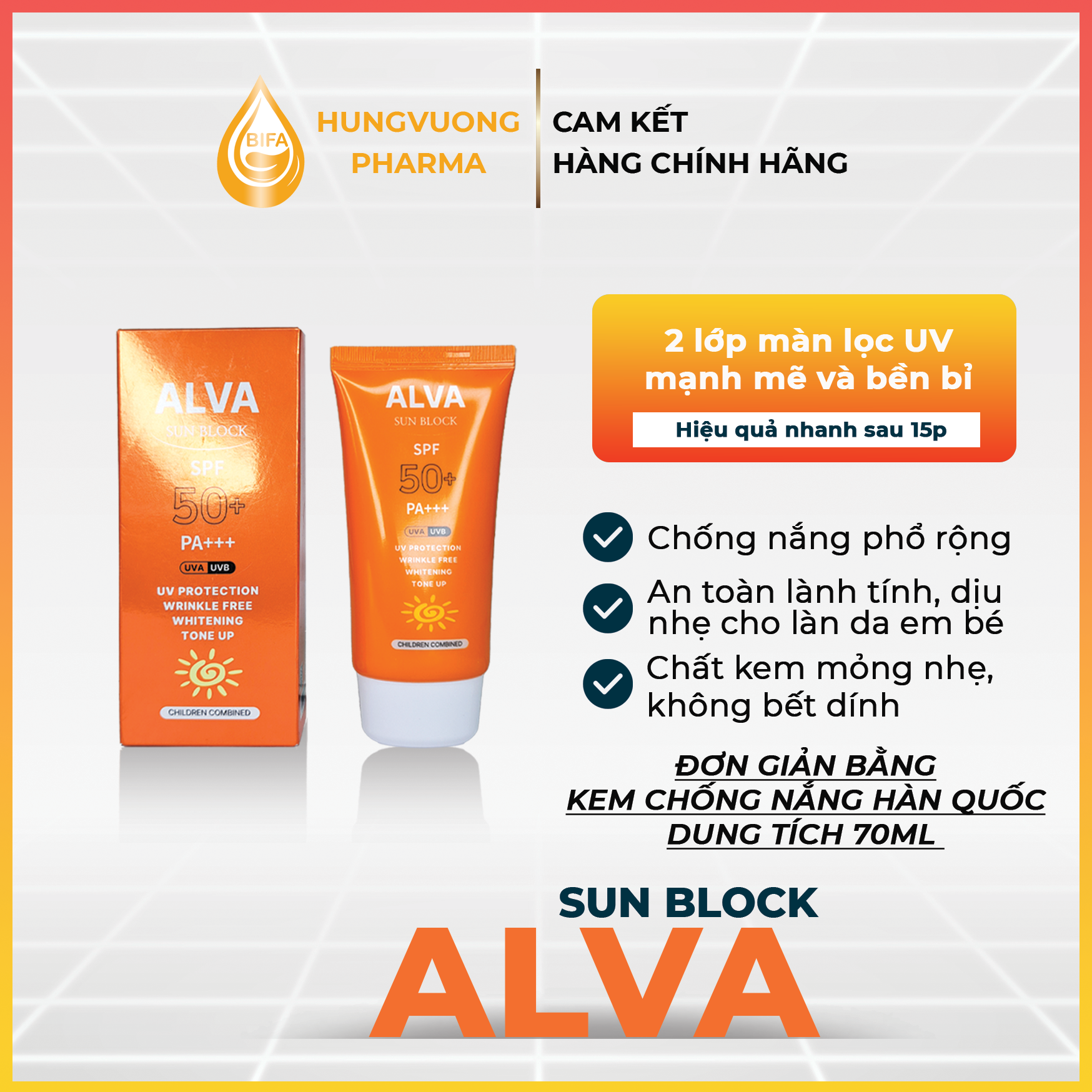 Đây là kem chống nắng chống thấm nước (Water-resistant) giúp bảo vệ da tối ưu khi hoạt động dưới nước, Alva Sun Block giúp cấp nước cho da, làm dịu da ngay lập tức, bảo vệ da trước tác động của gốc tự do trong ánh nắng mặt trời, củng cố và phục hồi hàng rào bảo vệ làn da tối ưu