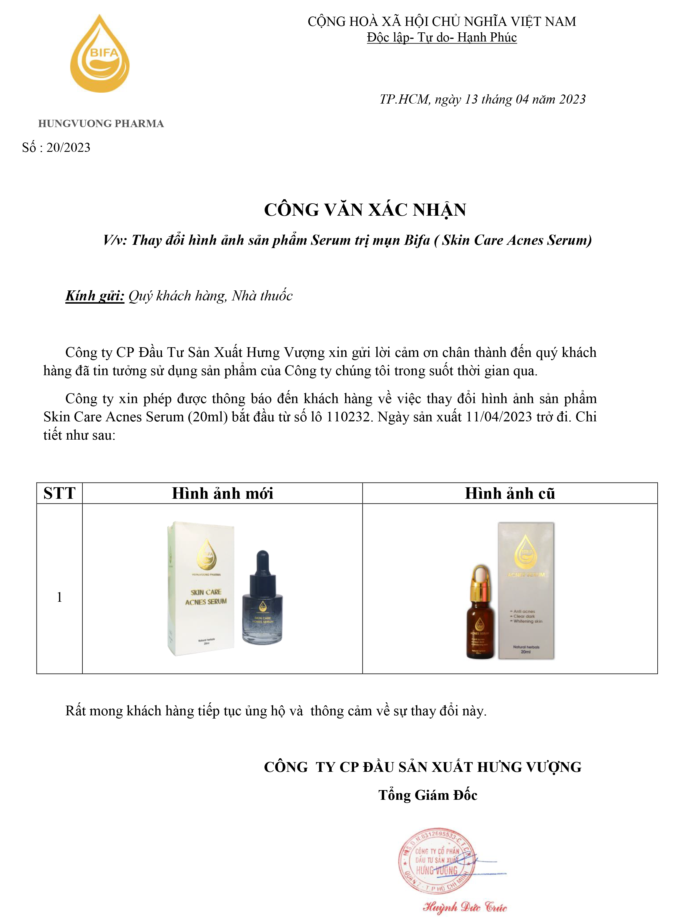 Công ty xin phép được thông báo đến khách hàng về việc thay đổi hình ảnh sản phẩm Skin Care Acnes Serum (20ml) bắt đầu từ số lô 110232. Ngày sản xuất 11/04/2023 trở đi.
