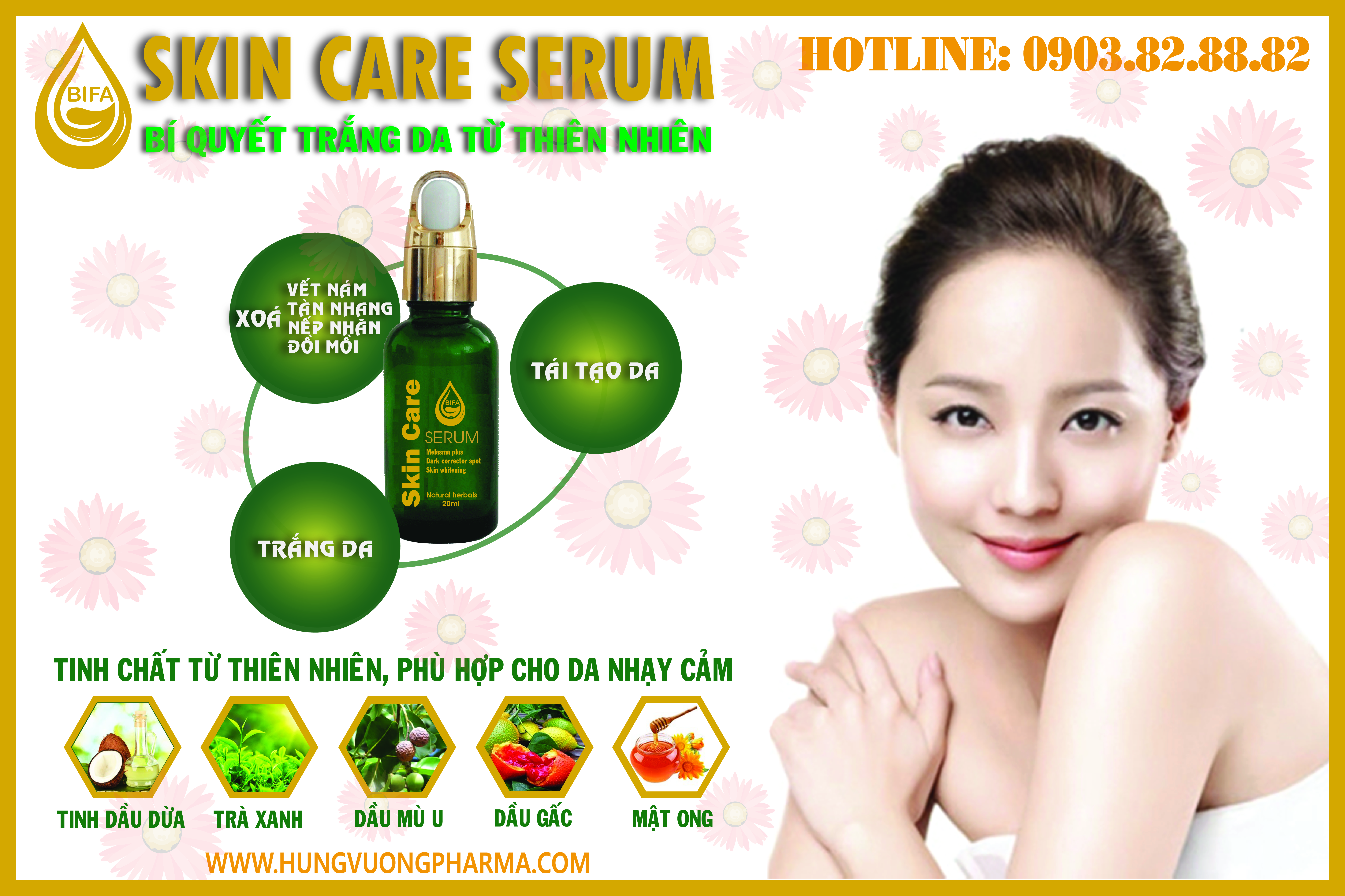 Với tiêu chí mang lại sự tiện dụng và hiệu quả cao trong điều trị nám da, vết nhăn, đồi mồi và làm trắng da. Skin Care Serum Bifa với được tổng hợp từ nhiều tinh chất từ thiên nhiên như dầu gấc, tinh dầu dừa, tinh dầu oải hương, bột lá trà xanh, mật ong... sẽ nhanh chóng thấm sâu vào da, tái tạo da, cho bạn một làm da mịn màng.