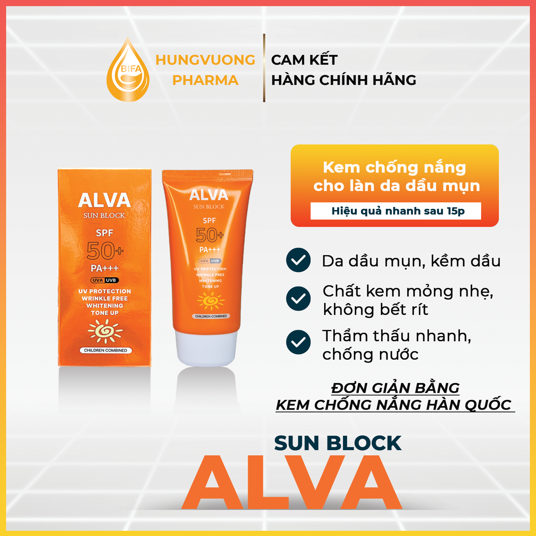 - Alva Sun Block SPF50+/PA+++: Kem chống nắng này có kết cấu dạng sữa mỏng nhẹ, dễ thẩm thấu và không gây nhờn rít. Kem có khả năng kiềm dầu tốt, se khít lỗ chân lông và giúp da khô thoáng suốt cả ngày. Ngoài ra, kem còn có thành phần Niacinamide giúp giảm mụn và làm sáng da.